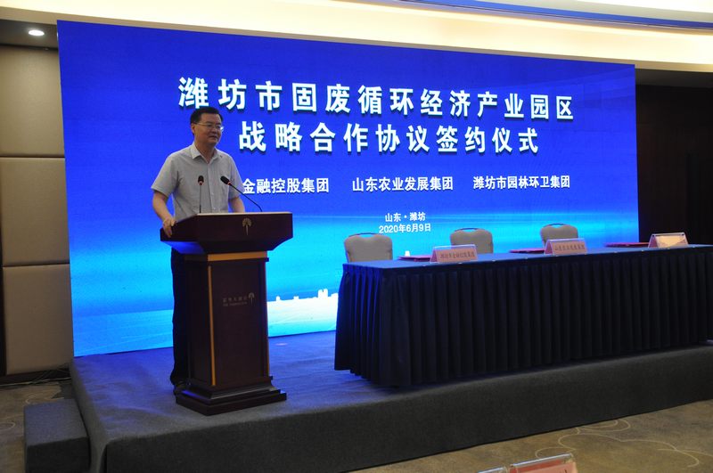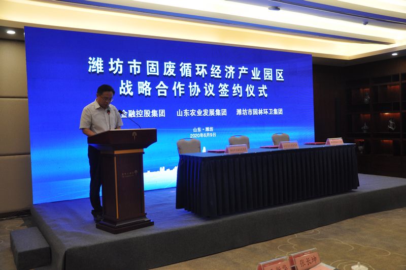 簽約儀式由山東農(nóng)業(yè)發(fā)展集團(tuán)董事長孔令杰和濰坊市副市長、市政府黨組成員田民利分別致辭??琢罱芏麻L在致辭中簡要介紹了山東農(nóng)業(yè)發(fā)展集團(tuán)發(fā)展概況、發(fā)展優(yōu)勢和產(chǎn)業(yè)布局,表達(dá)了開展合作的誠摯意向,對深化三方合作信心滿滿。表示將以此次國家新修訂并馬上實(shí)施的固廢法為契機(jī),同市園林環(huán)衛(wèi)集團(tuán)、市金融控股集團(tuán)一道,在濰坊市打造高標(biāo)準(zhǔn)固廢循環(huán)經(jīng)濟(jì)產(chǎn)業(yè)園區(qū),搶占固廢領(lǐng)域科技和政策制高點(diǎn),為最終實(shí)現(xiàn)無廢城市目標(biāo)而奮斗。